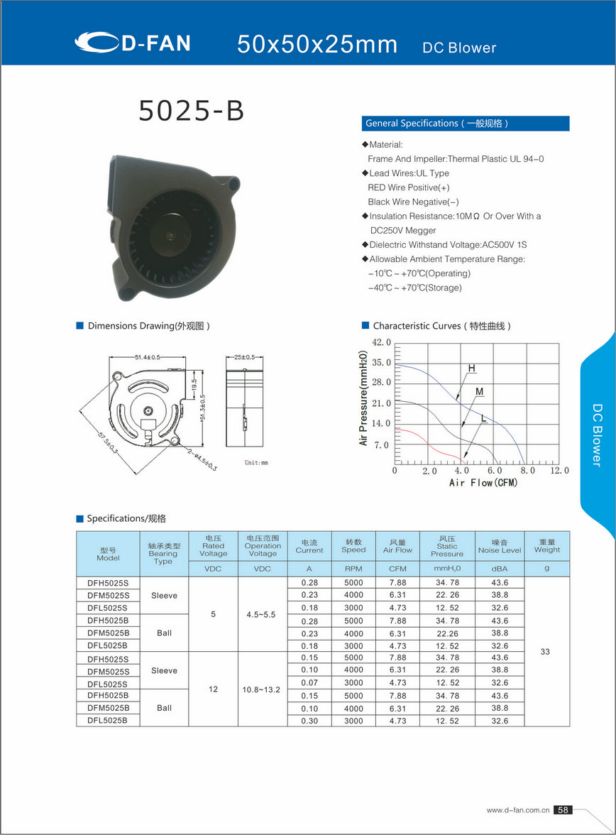 材料: 框架和叶轮:热塑UL 94-0 引线:UL型 红线正极(+) 黑线负极(-) 绝缘电阻:10MΩ或以上,带DC250V高阻表 介质耐压:AC500V 1S 允许环境温度范围: -10℃~+70℃(运行) -40℃~+70℃(储存)